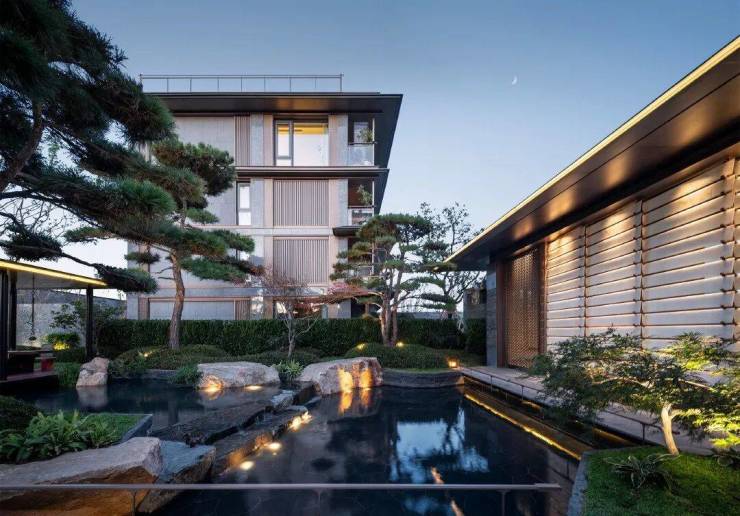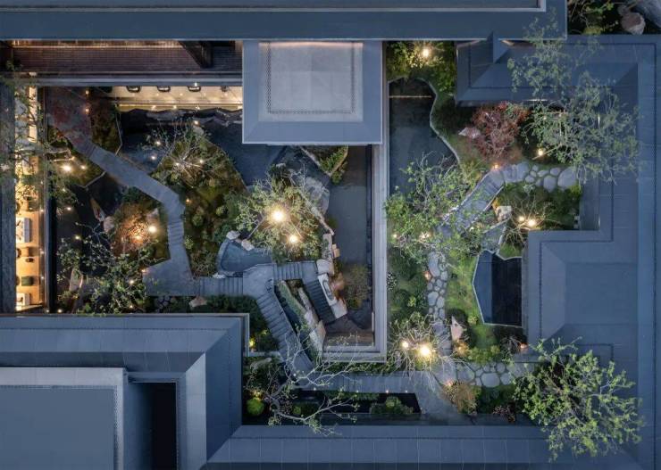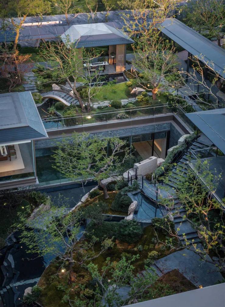 通过下沉会所庭院,将传统平面绿化转化为垂直的多层次园林空间,打造出了当代立体山体水景观,身处其中在步履起承转合间,串联起一幕幕诗画风景。