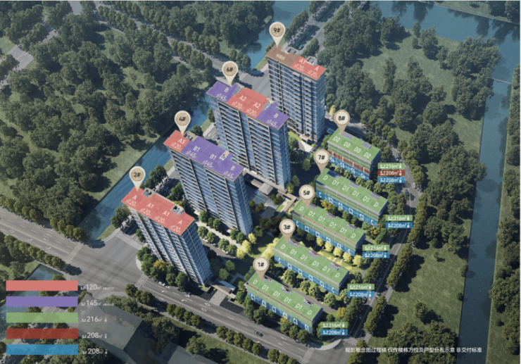 项目规划有4栋14-16F高层及5栋4-5F叠拼,容积率2.0。共计267套商品住宅,主力包括建面约120㎡、145㎡高层户型;建面约208㎡、216㎡叠拼!