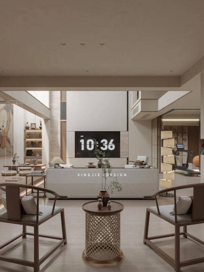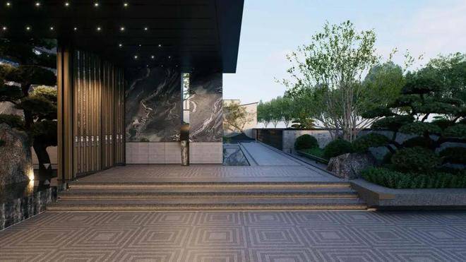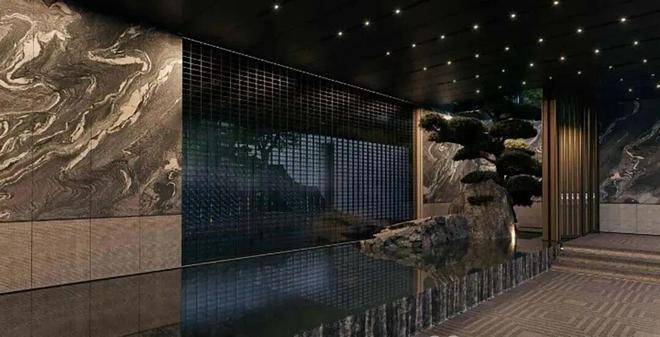 而门口的墙面,更是用大理石与绿植山石装裱出一幅立体的山水画,在垂直立面上演绎“石中有画,画中有境”的宋式空间美学。为了契合宋代织锦的“天华纹”,泳池对景墙独创了“琉璃錾铜·经纬叠映”的构造,以铜为骨,内嵌玻璃砖墙,用琉璃构建出特殊的“经纬提花”.