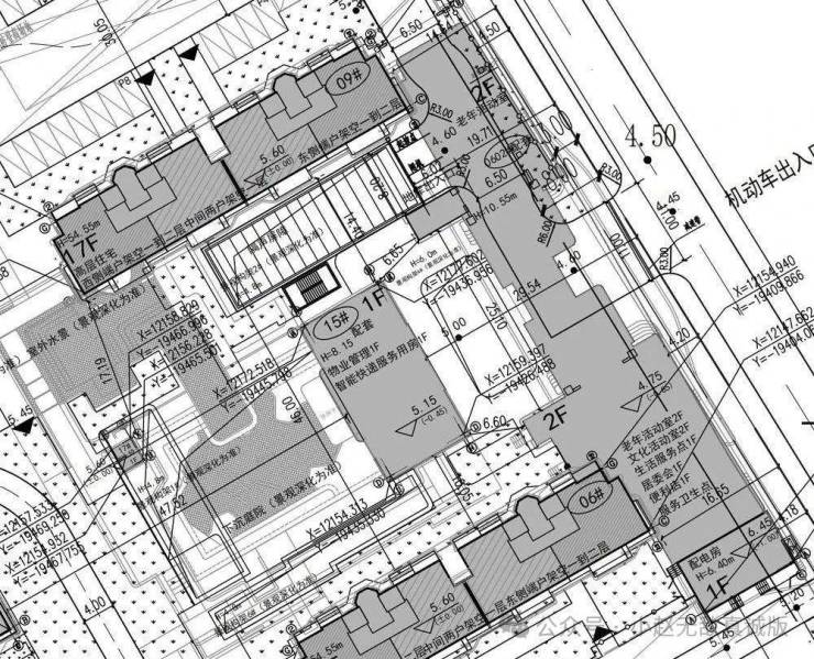 小区东侧是主要的人行和车行出入口,进入社区以后,是个配套用房,用来物业管理以及放置智能快递柜;在配套之后,是一处下沉庭院和室外水景。