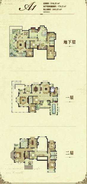 结构:地上两层+地下一层,赠送地下室(174-230㎡)及私家花园(200-900㎡)