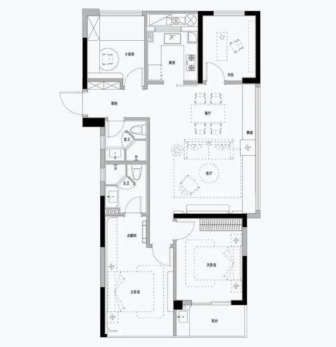 (建面约)111㎡边套做了四房,面宽约6.1米的一体化餐客厅,面积近30㎡!南向双卧,同样有着面宽约6.4米的南向双联阳台。