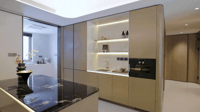 中西厨结合设计,满足各类烹饪需求。西厨定制高柜,容纳烤箱、嘉格纳双开门冰箱、洗手台以及各类收纳空间;中厨自带嘉格纳灶具、油烟机和洗碗机,该户型专门拥有北向生活阳台,可以放置洗烘设备。