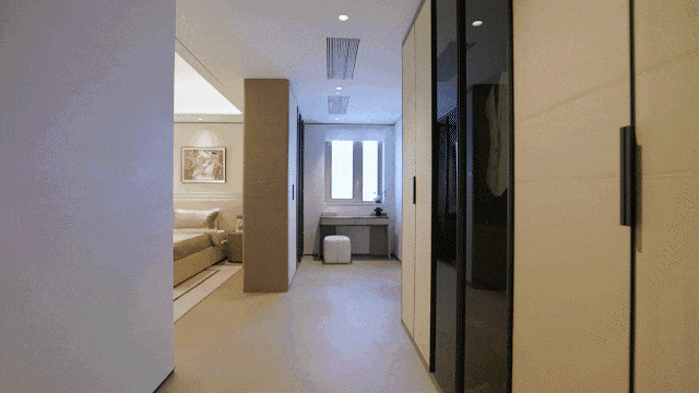 最后是重头戏——主卧套房。进门后可以发现,足足有三处位置能摆放各类柜体,收纳空间绰绰有余,南向面宽也非常阔绰!