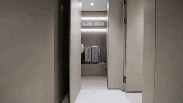 入户进门就是独立的玄关,玄关左侧还设置了专门的储藏室,能够塞下好几个大行李箱,而且每个户型都有这样的储藏空间。