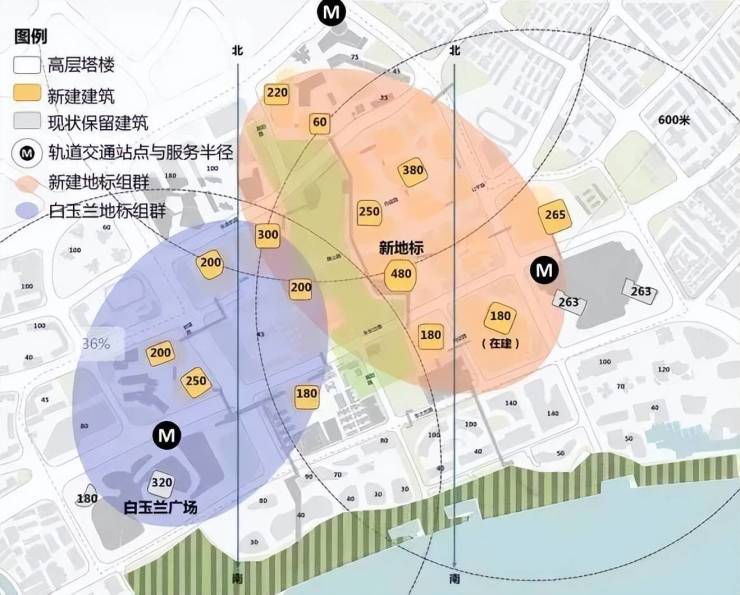 项目南侧的北外滩核心区,是发展的重中之重。1/5的土地上,将承载了北外滩超四成的建筑体量,商务办公占据了主导地位。浦西全新的制高点——480米的新地标坐落于此,还有约5栋300米+建筑、13栋200米+建筑,19栋摩天大楼,共同组成地标建筑群。