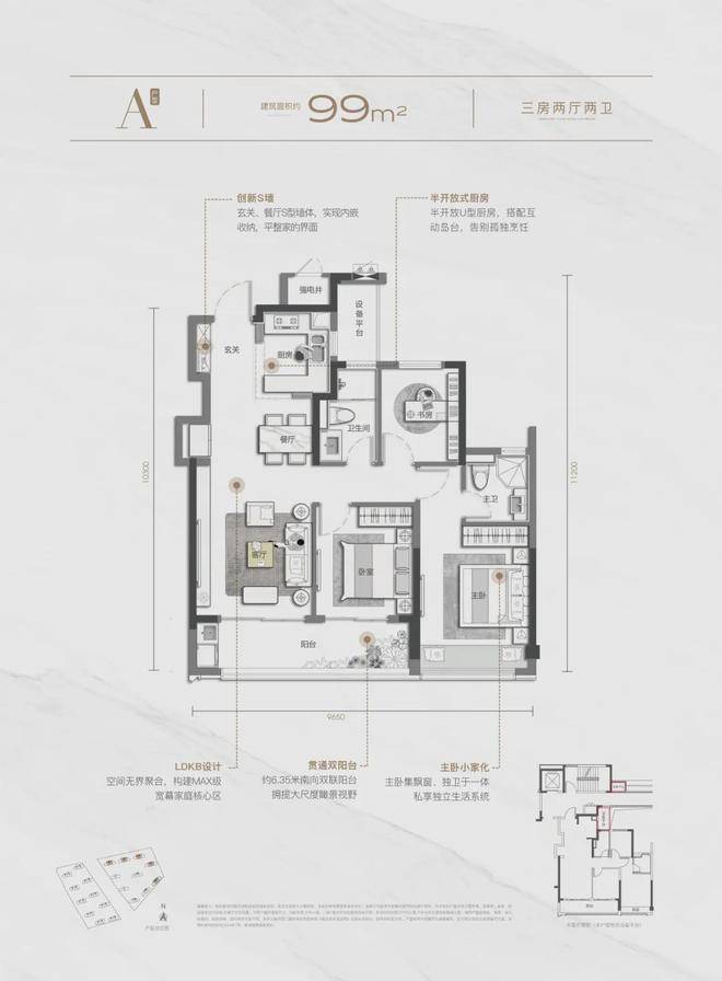 建面约129平方米四房两卫和99平方米三房两卫的户型,也都各有亮点。前者具有宽屏大横厅和约9.1米跑道阳台,后者也具有约6.35米的起步双联阳台,视野开阔。