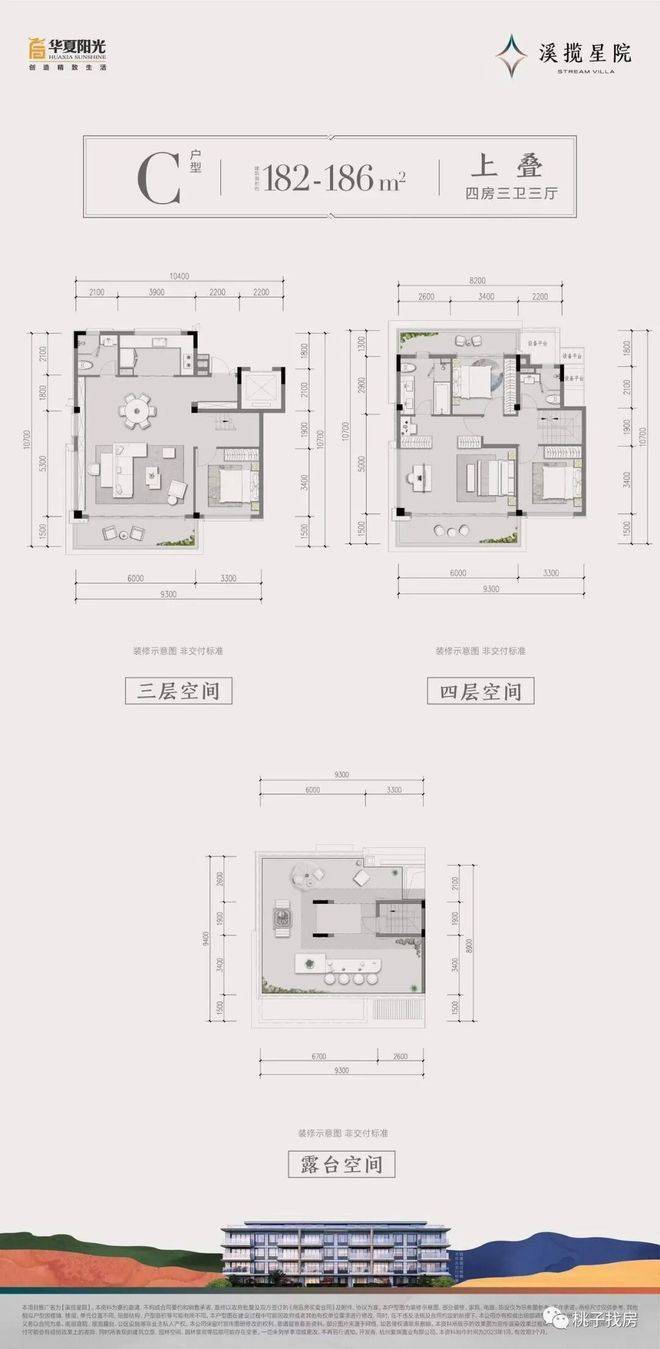 建面约182~186㎡上叠:约6m顶层观景阳台/餐客厅、书房开放设计/套房式主卧