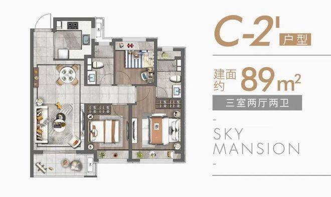 建面约89㎡(三房两厅两卫)