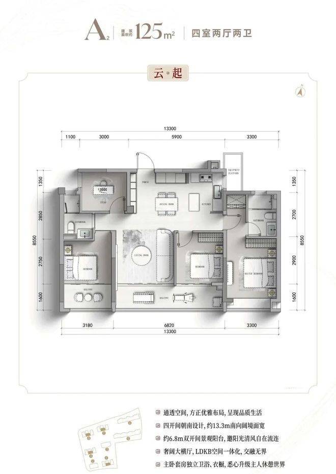 125㎡ 4室2厅2卫(中间套)四开间朝南设计,南向面宽拉满,采光通风效果俱佳;LDKB空间一体化布局,灵活适配二孩家庭日常居住需求;主卧套房设计,配备独立卫浴与专属衣橱,私密性十足;封闭式阳台可灵活改造,进一步提升空间利用率!