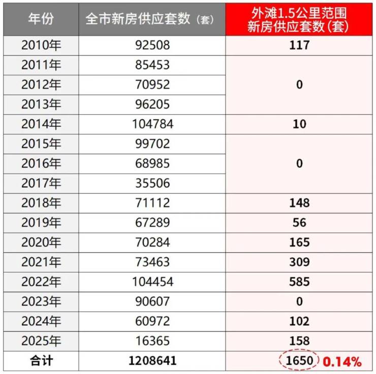 据小胖君统计,自2010年至今,外滩1.5公里核心圈内仅供应1650套新房,占全市新房总量比例低至约0.14%。