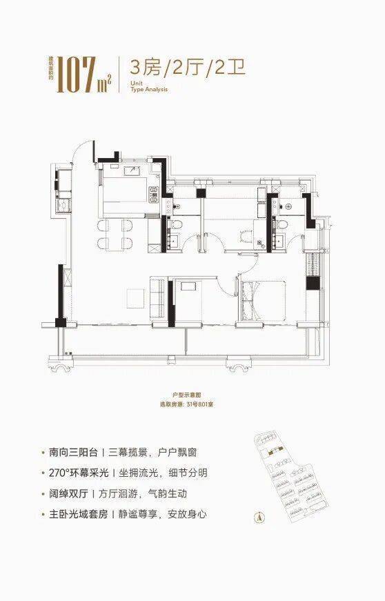 大华星屿建面约107㎡户型南向2个大阳台的合计面积接近16㎡,远超新规标准。如果再算上飘窗附赠以及电梯厅延伸空间,实得率接近100%!同时建面约107㎡户型做到做到了约5米超大宽厅设计,3.5南向面宽+南北通透的格局让采光通风效果俱佳。主卧套房配置,朝南次卧面宽约3.2米外接阳台,朝北带大飘窗,做到了真正的大三房功能,每个空间的尺度都远超同面积段区域其他产品,妥妥的明星户型!
