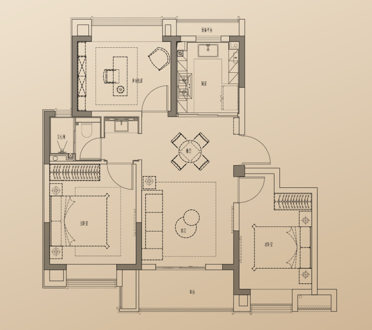既实现了3房的功能性一步到位,又实现了主卧套房,整体两个卫生间的配置,首置首改皆适配;