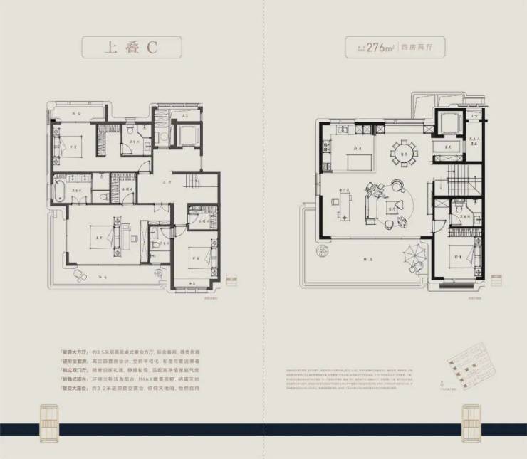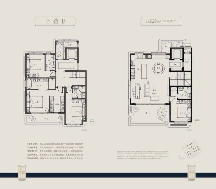空间设计充分发挥了纯四层叠墅的产品优势,上下叠的独立入户,上下叠独立的归家动线,互不干扰。此外,上叠卧室静区在三层,客餐厅放置在四层、外联大露台,有效避免了与下叠休息静区的彼此干扰,动静分层有序处处有景。