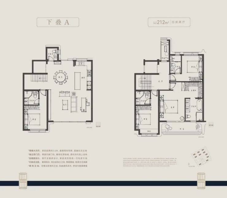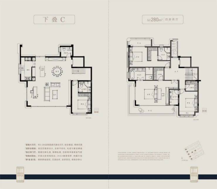 户型方面,主力建面约210-280㎡四层叠墅,采用全套房设计,朝南大开间阳光满堂,主卧“小家化”,步入式衣帽间和独立卫浴间兼备,更大尺度的面积,更开阔的家庭社交区,更舒适的套房空间。约6米层高地下空间,多出一大片公共活动空间。大部分下叠设计了双采光井,在地下室也可以获得充分的自然光。