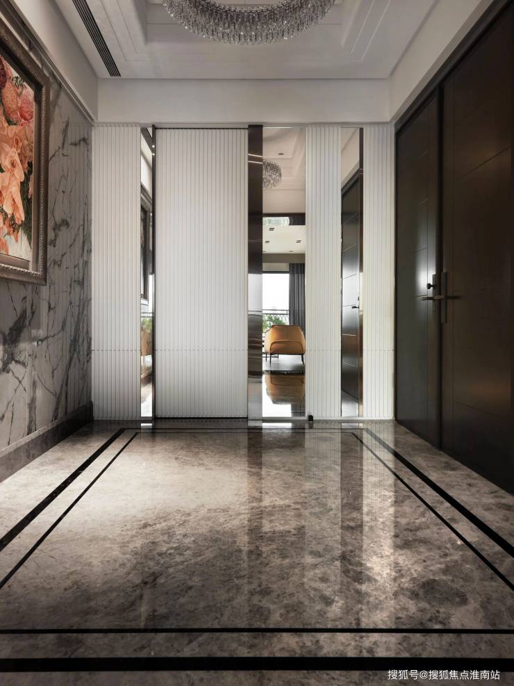 玄关以白色大理石妆点墙面,灰色石材辅以黑色大理石围边的细腻巧思,营造美学层次。
