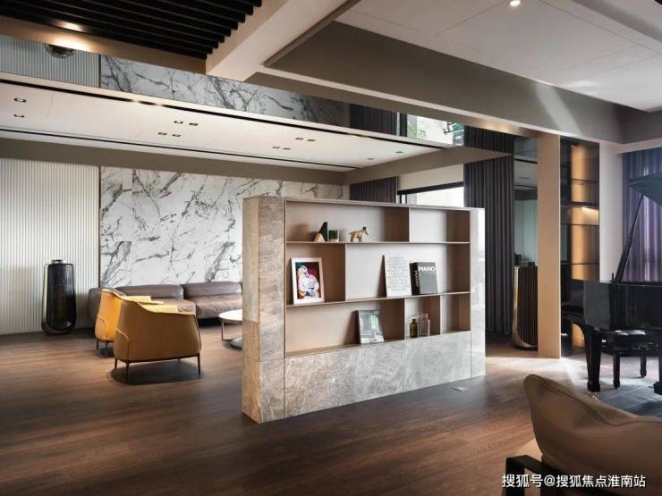 客厅、交谊厅、餐厅融会贯通,展现豪宅气势;大理石电视墙伫立于客厅与交谊厅之间,起到隔断作用,下方搭配壁炉设计,冷暖平衡。