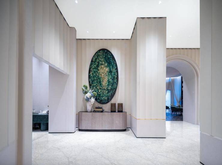 420㎡户型独享80㎡屋顶花园,融合意大利石雕水景与立体绿植墙。