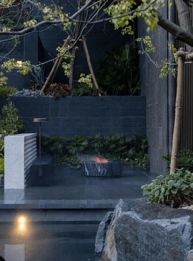 而在3、5号楼之间,则搭建了【围炉夜话】场景空间。古木纹奢石砌成的火炉旁,整木炭化石凳散发着山林野趣,一株红舞姬枫树翩然伴舞。冬日傍晚,好友围坐,体会名门温情。