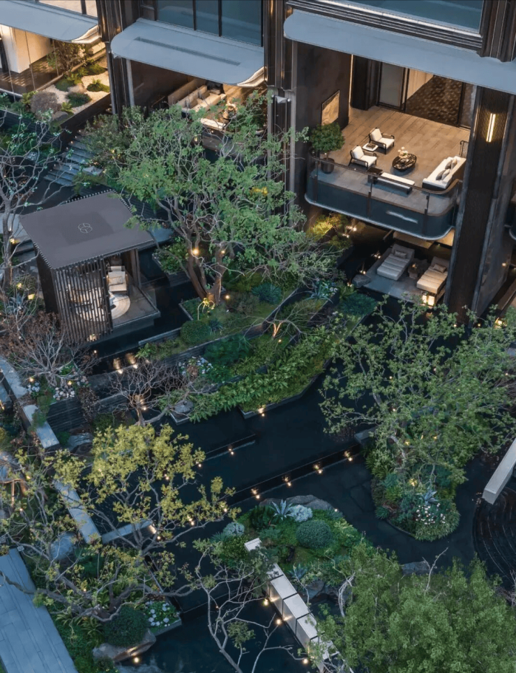 山川溪谷与休憩架空层空间共汇,于庭园深度,打造一处可游、可观、可赏的自然谧境。
