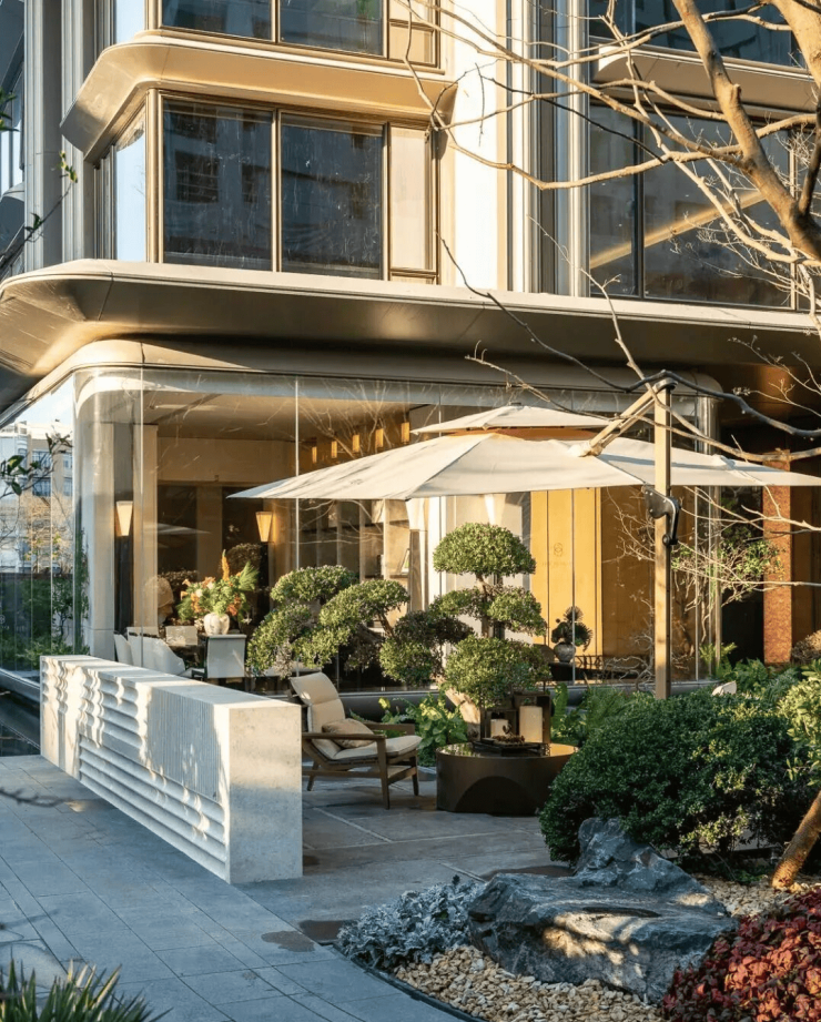 并参考世界度假酒店休憩区,在5号楼下打造一处极具松弛感的度假水院——【泊心逸境】,可在此独对山川,亦可与聆听溪谷潺潺之音。