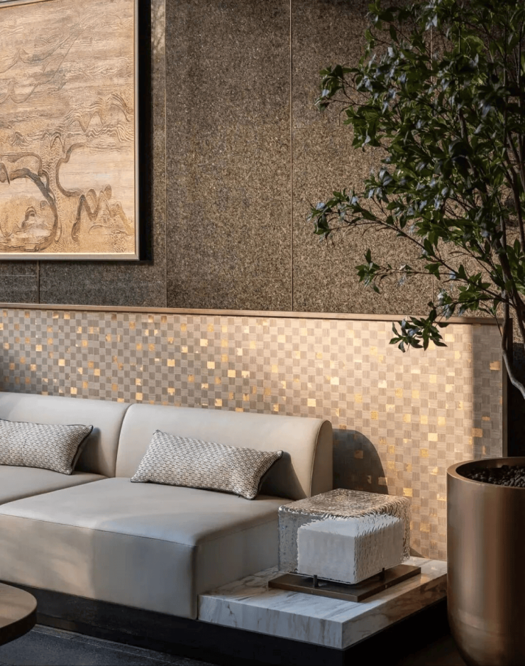 黄金丝绸大理石流转着真丝般的光泽,白玉与卡里冰玉小台映照天光云影。