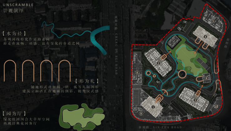 165米的高度不仅象征物理空间的突破,更寓意城市发展从“横向扩张”转向“立体深耕”。总体设计因地制宜“一叶四星”进行布局,充分发挥三边沿街,一边临河的环境优势,将最高的1号楼(49层)的建筑布置在成都北路与新闸路转角处,次高的2号楼、3号楼(44层、45层)分列成都北路、新闸路两侧,4号楼(16层)布置在基地北侧,形成了一个高低兼顾,启承有序,开阖有度的整体布局。