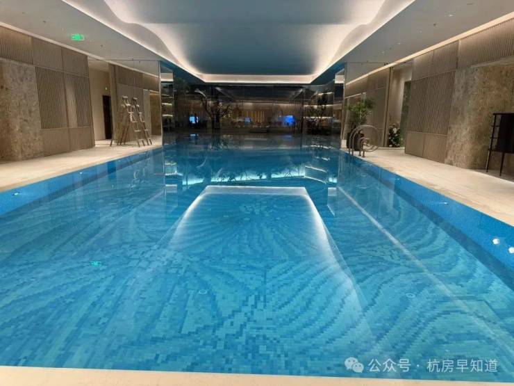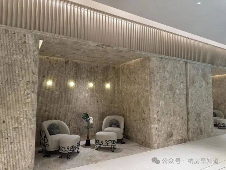 公区配备了2800方会所,恒温游泳池,棋牌室,红酒雪茄室室,品茗室,健身房等等,公区配置几乎全部拉满,大面积石材用料,实景展示公区材料堆砌很足,到处都是各式纹路、花式裁切的石材,看得出招商是用心打磨产品的