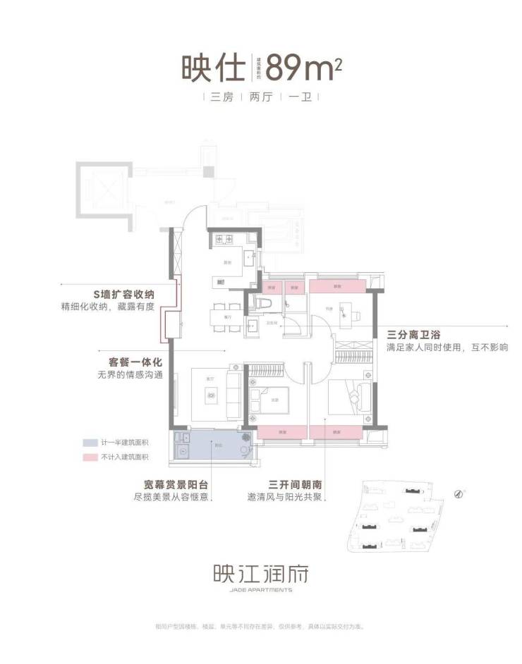 其次是户型设计。在户型产品同质化严重的当下,映江润府花更多心思在户型创新设计,给到置业者更美好的家的体验。建筑面积约89㎡王炸小豪宅户型,拥有四大高光细节和创新设计,在市面上同类产品中非常能打。