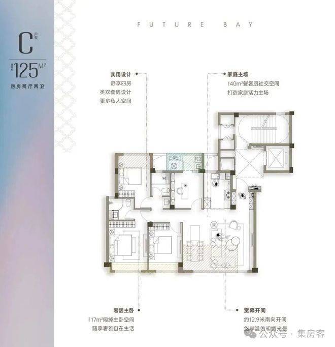 约139方户型,4.5开间朝南+储藏间,南向15.9米超大采光面,做到五开间朝南的空间,标配储藏间,三个南向卧室设计。