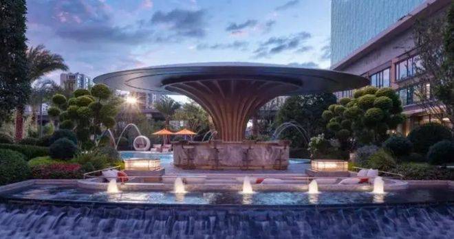 中央水景实图:景观灵感源自著名珠宝品牌CHAUMET,以“繁花造型珠宝”为设计理念,将大胆、华丽、创新于景观之中,形成特有的珠宝风格景观设计系统。