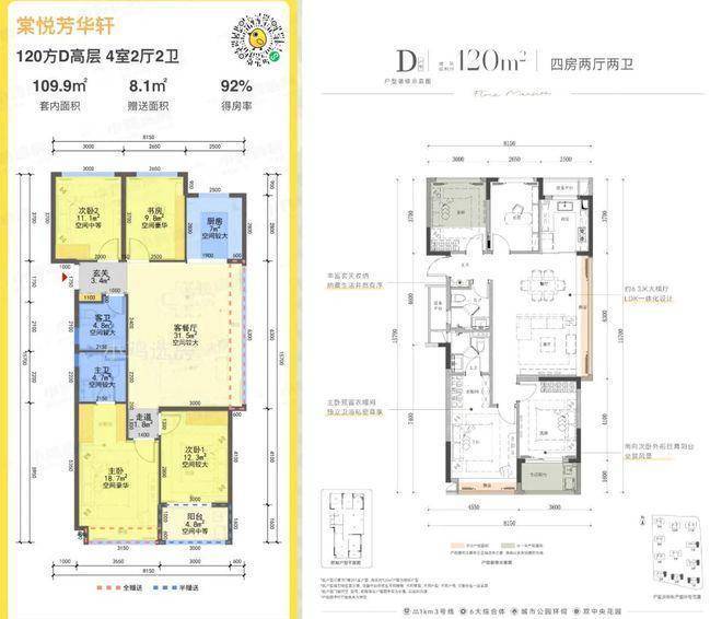 (2)更大一些的户型如建面约120m²的四房边套设计,南向双卧室+客厅大飘窗的设计提升了居住舒适度。