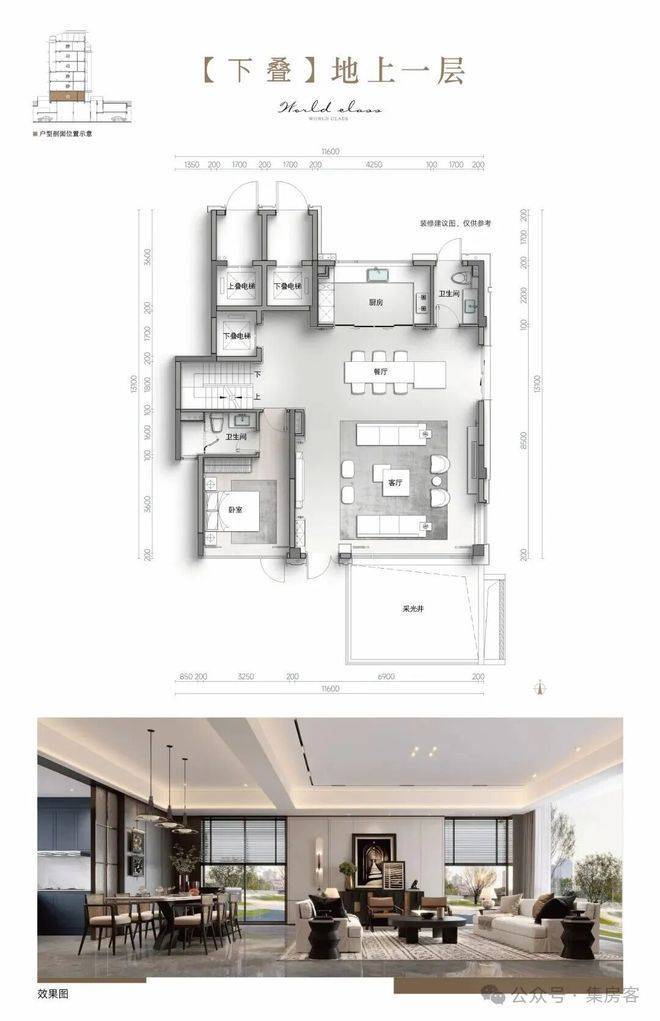 叠墅产品以高级审美+全系统高配定义高端居住标准。客餐厅地面采用灰色石材,日立中央空调、电梯及迈迪龙新风系统构成全维度舒适体系。厨电五件套包含西门子蒸烤一体机等。所有户型预留扫地机器人接口,上叠屋顶露台配备上下水,可改造为空中花园。地下私人独立车库,地下室毛坯交付后可以按自己的需求装修。