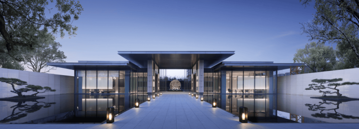 ◆二进|登门望府 :以画景还原的方式,打造飘逸巍峨的“三重檐”,结合七开间秩序的建筑手法,还原传统中式大门的礼序考究。