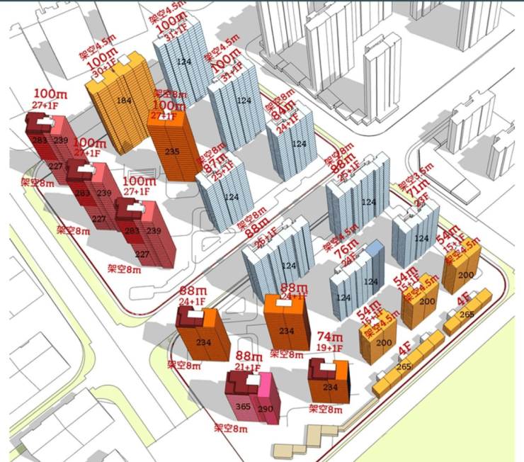 项目将建造9栋高层住宅,其中西侧三栋标红的楼栋,被旋转至西南方向,确保三栋楼互不遮挡,位于建筑上部50米高的住宅单位将能从各个角度欣赏到江景及S湾。