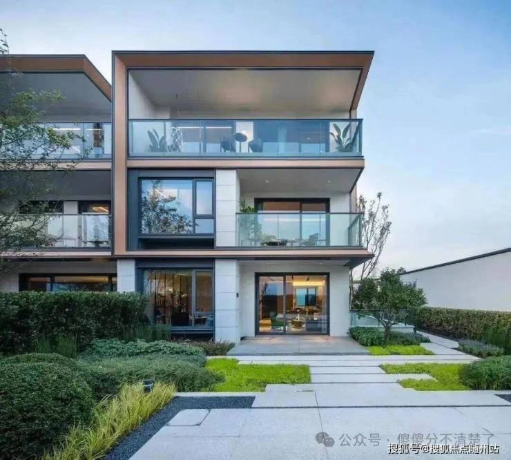 “油画框”立面,让建筑有了一份艺术的沉淀。如大华的斜切45°香槟色木纹铝板,让外立面更几何、立体,在光影交错间,优雅而灵动,满满“高级感”杭州大华春山隐树院,极简的建筑线条,大面积的通透玻璃,配合“油画框”式的设计元素,完全是现代主义美学。