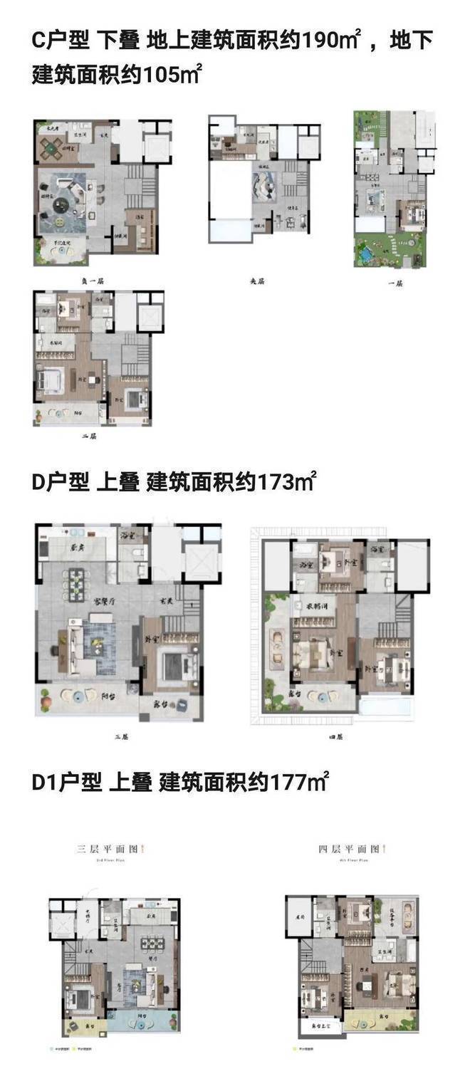 叠墅:4层,建面173-295㎡,分层设计,地下室层高5.3米