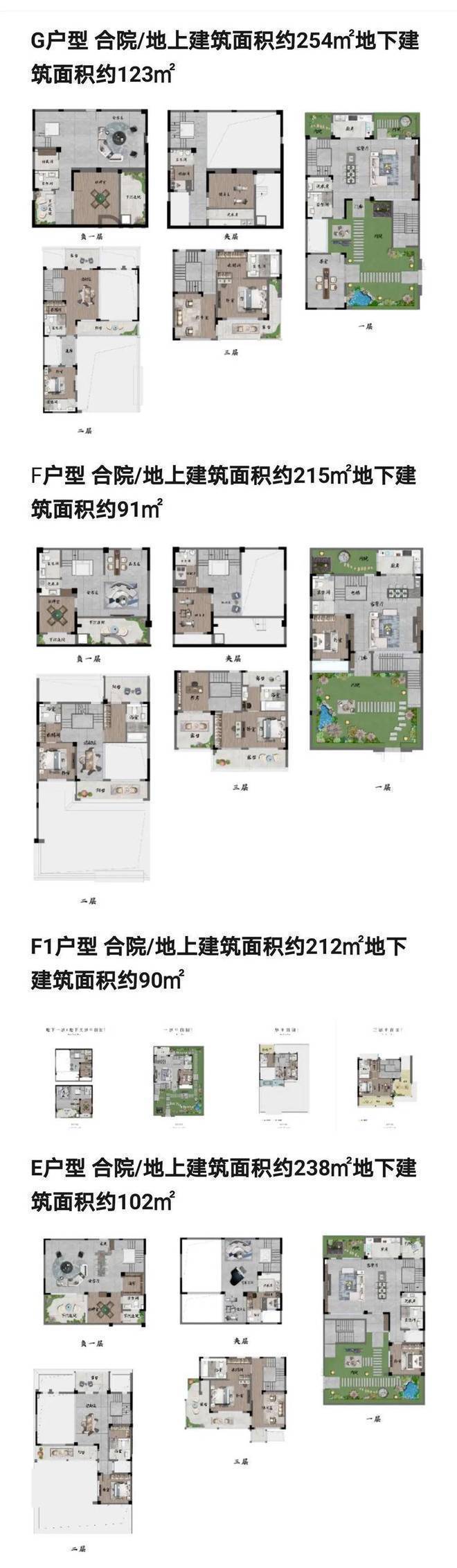 合院:3层,建面306-377㎡,带庭院及地下室,强调私密性