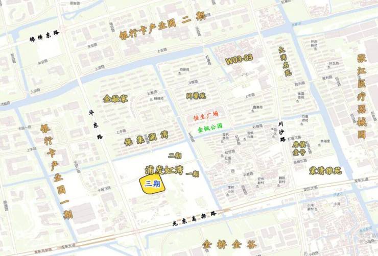 浦发虹湾,位于龙东大道和华东路的交汇处,所处的整个区域,四面环水,就如同一座漂浮在水面上的“环屿之城”。