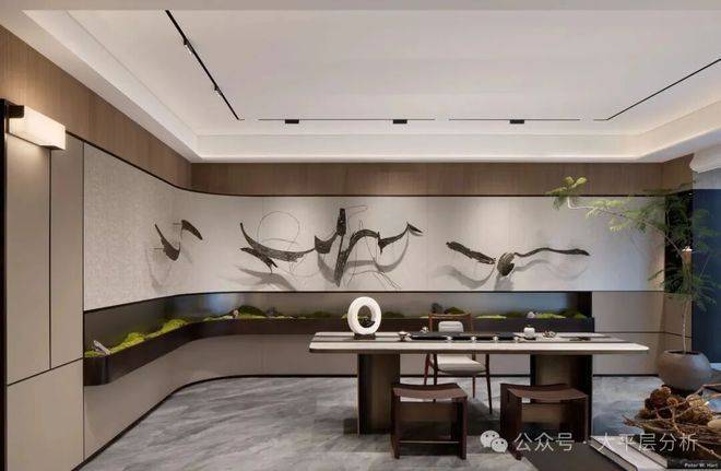 经典名画《西湖全景图》中的丹青意蕴融入空间营造,以风景开阖、空间对比等传统设计手法,结合青绿编织景墙、青玉、皮革和编织纹以及苔藓微山水景观,创造一处奥体之上江南庭院,和鸣经典美学生活。
