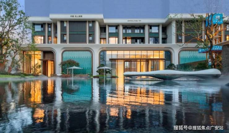浮光池院水院会客厅,现已实景呈现,水景中央的艺术小品,如一滴水在湖面晕开,泛起阵阵涟漪。