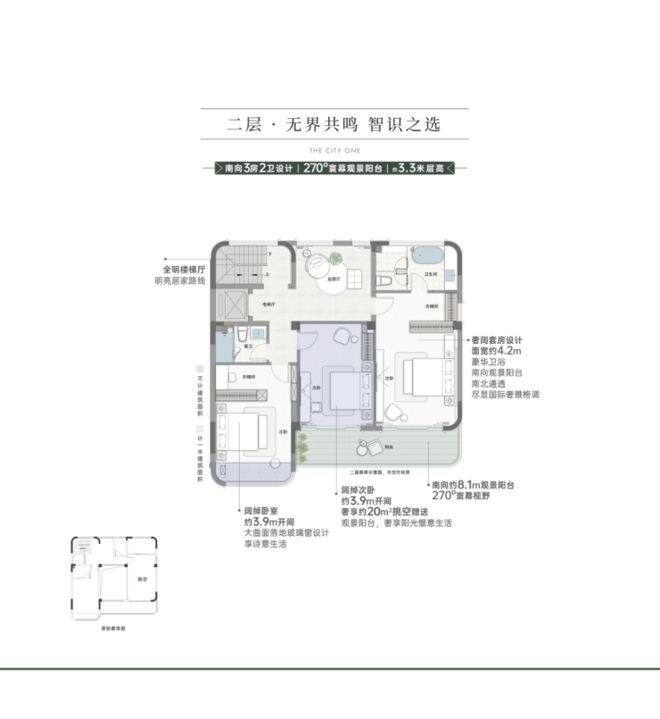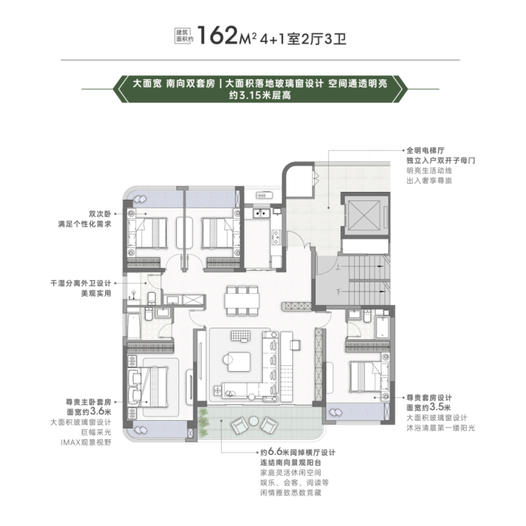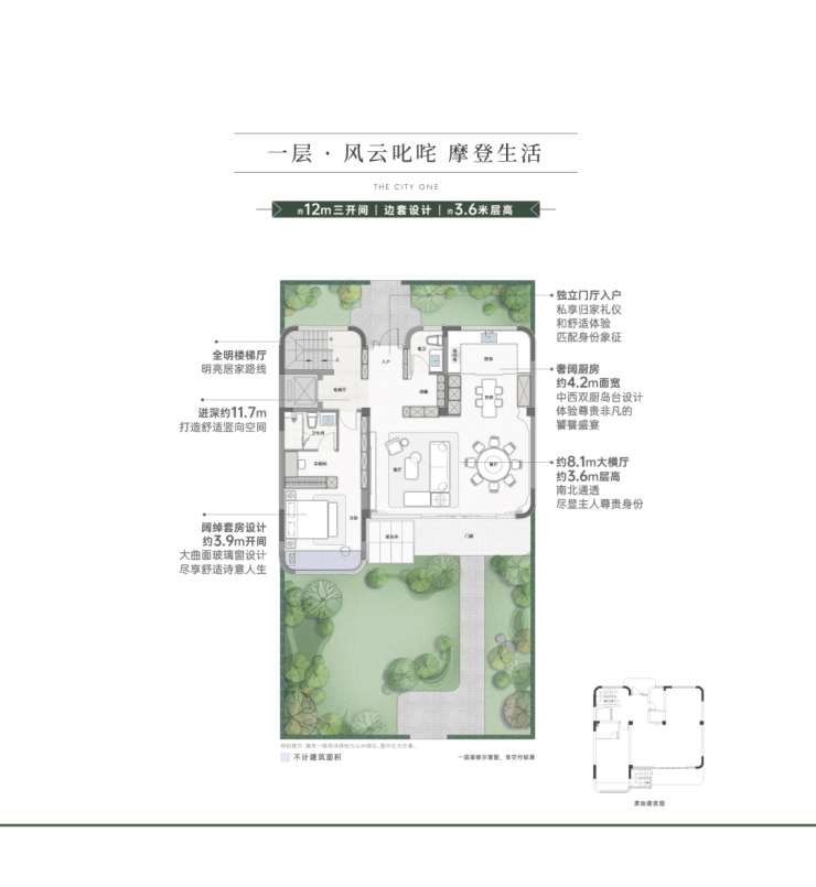 建筑面积约319㎡户型打造约18米L型跑道式观景阳台,约270°寰幕观景视野,大玻璃窗设计完全拉通了采光观景面,仿佛在家中打开了一个IMAX环幕全面屏,时刻观赏3D环绕式的自然中央景观。
