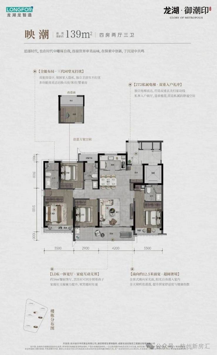 约139方户型,南向面宽则达到了惊人的约13.9m,四开间半朝南,客厅面宽约4.2m。关键做到了3卫双套房,特别适合三代同堂。同样约139方三卫,世纪城的君品是2T4的,而御潮印则是2T2,独立私梯入户,还拥有阳光入户花园和双重玄关。龙湖御潮印楼处电话:400-9016-520(官方售楼处电话)