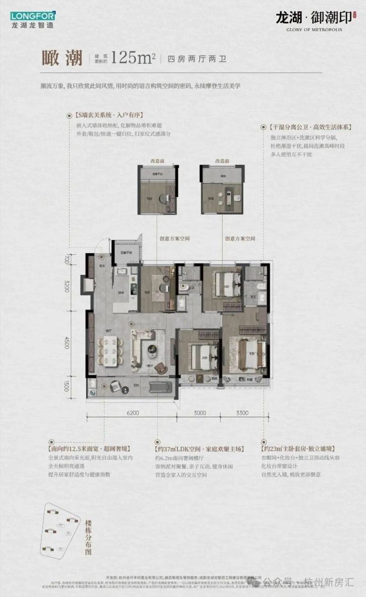 168㎡云端大平层:封面人物的“终极藏品”约16米南向面宽(四开间朝南),搭配“总统式”主卧套间,主卧套房配备270°转角飘窗,尺度比肩200㎡+产品;约15人宴客厅+多功能书房,次卫嵌入智能雾化玻璃、全屋配备龙湖智慧家居面板。