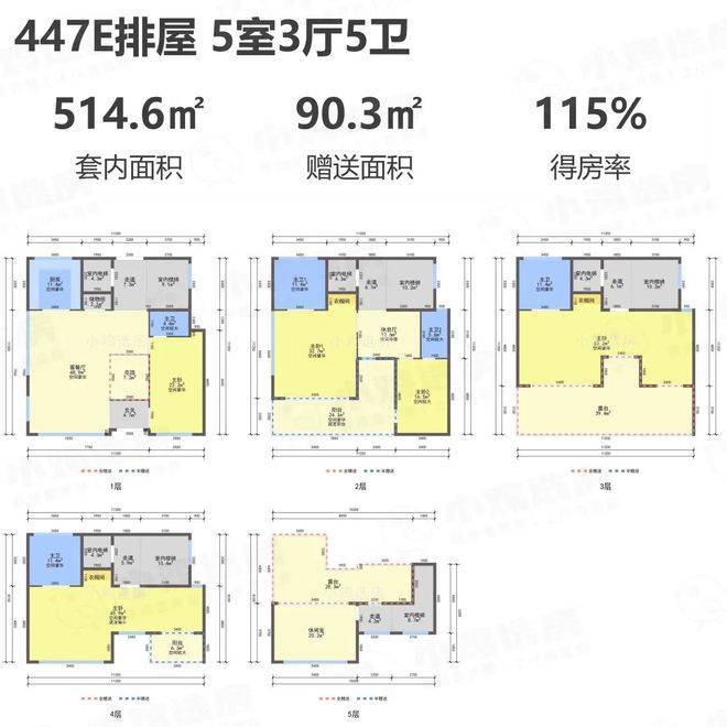排屋最大户型为建面约447㎡五房三厅五卫户型,具体户型图参考如下所示。