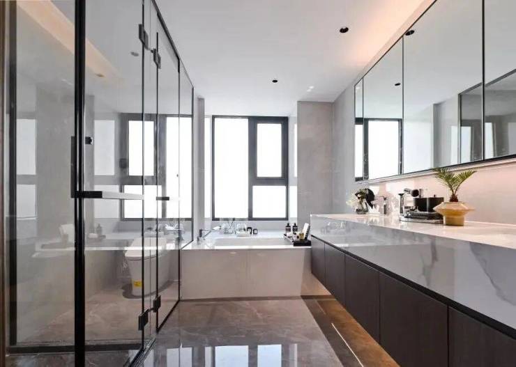 朝南大尺度飘窗带来全明采光,L型超大衣帽空间,女主人的衣服、包包都可妥善归置。值得一提的是,主卫不仅配备了双台盆,并且还做到了四分离设计,洗漱、淋浴、马桶、浴缸都在不同的空间,真正做到了私密而舒适。