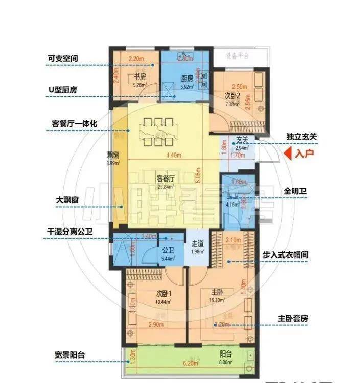 首先,这套建面约106㎡户型,首推 创变空间,整个户型南向面宽达到了惊人的约11.7米。