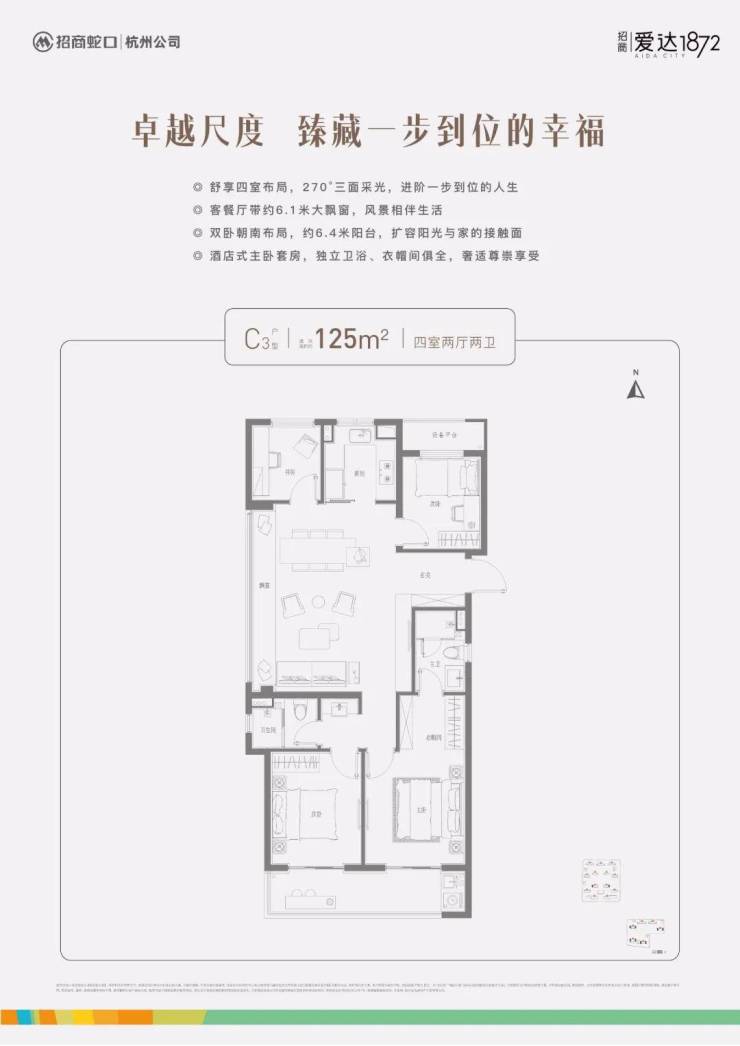 约270°采光面、双卧朝南动静分离、二分离式公卫、主卧豪华套房,不说别的,就冲着图中展示的各项维度,这套大四房就值得用心珍藏。