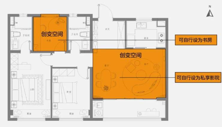 由此带来更具尺度感的公区,彰显主人气度,同时也更具想象空间。业主可以自行设计成家庭影院,北面的房间可以用作卧室,也可以设计为书房,让家随心所欲。