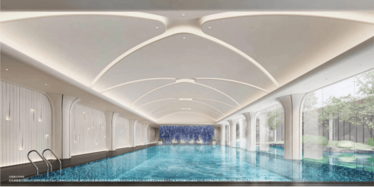 艺术馆般室内无边际泳池,在内部空间设计上,微微拱起的穹顶像云朵漂浮在上空,两侧的柱子成花瓣般的典雅造型,向上延伸,形成独特的记忆点。中央庭院一侧的落地幕墙玻璃,实现自然景观的室内延伸感。泳道尽端的景泰蓝背景墙,更是加强了空间的奢华氛围。
